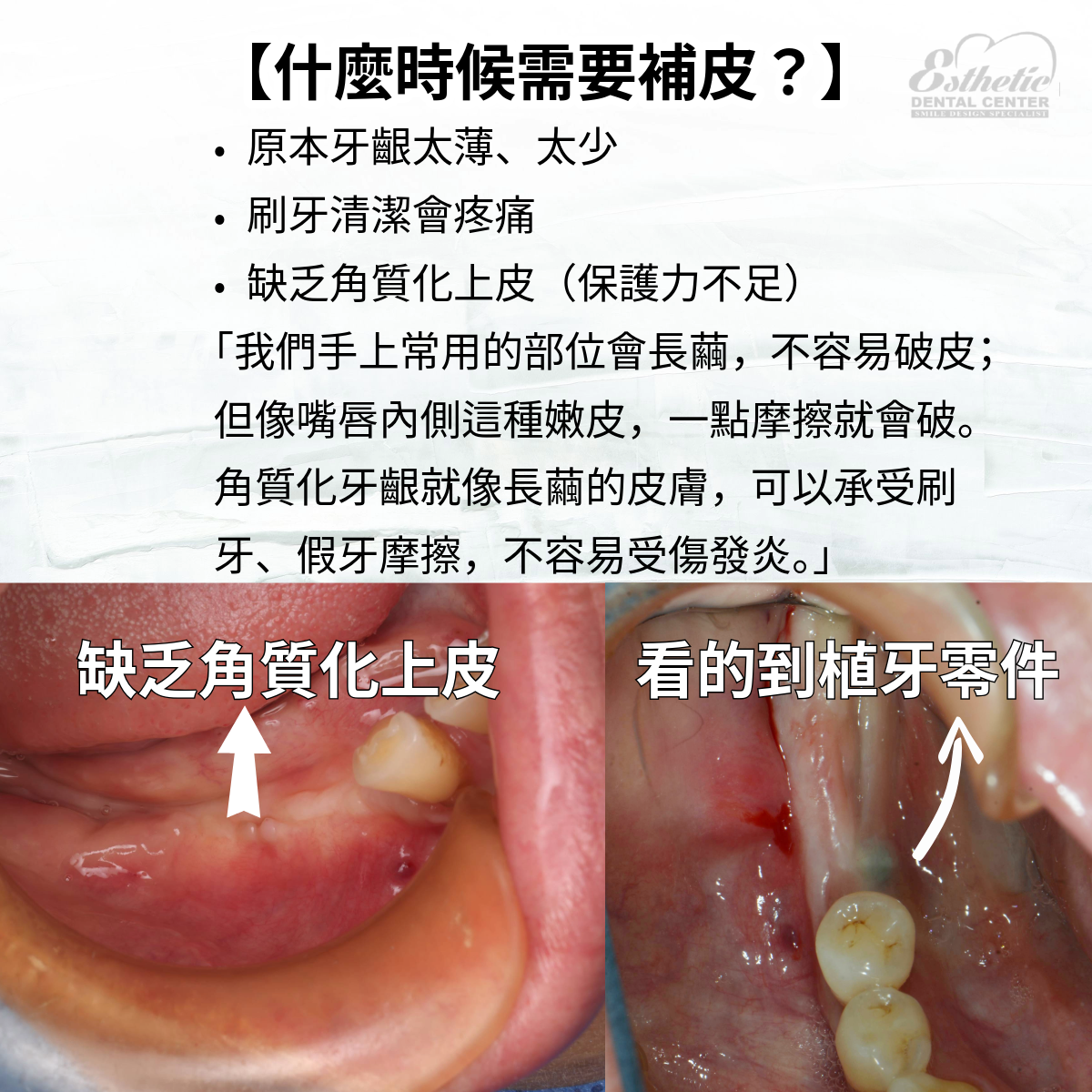 角質化牙齦就像長繭的皮膚,可承受刷牙與假牙摩擦,幫助植體抗發炎、防退化、用得更久。這時進行補皮手術,就能大幅提升植牙區的穩定性。