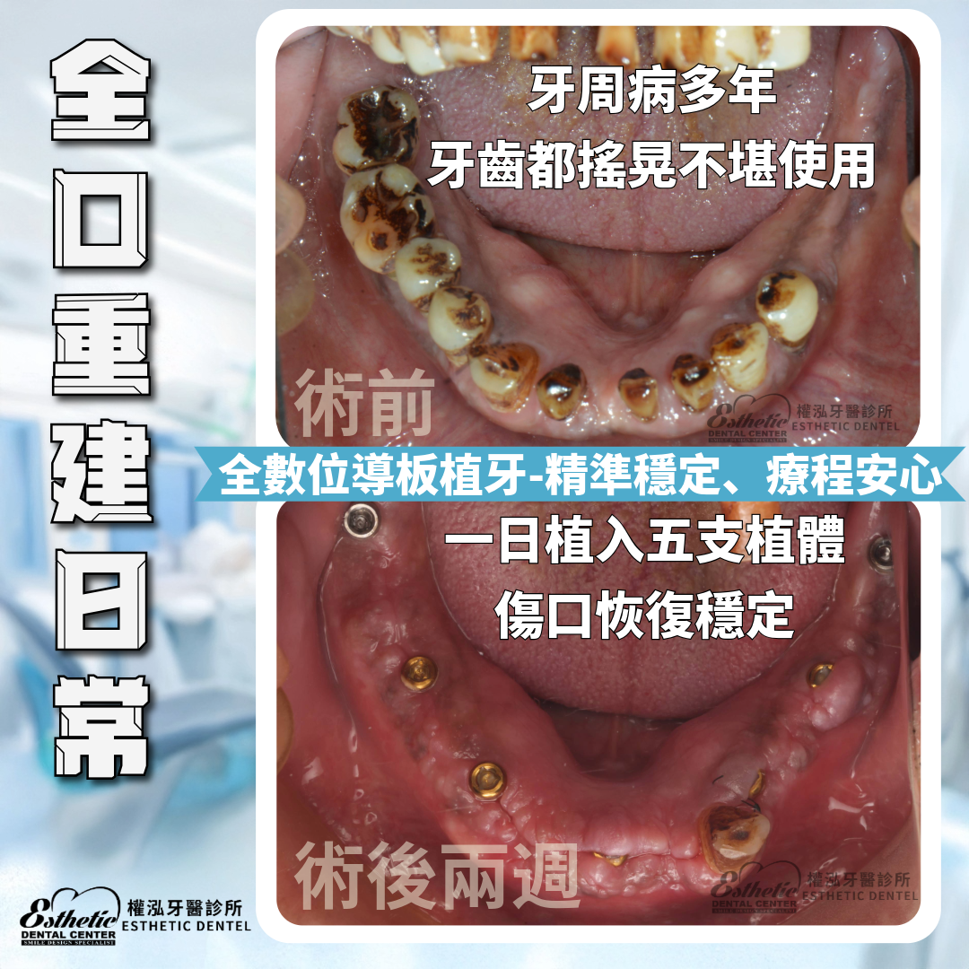 多年來,這位患者受到牙周病的困擾,牙齒逐漸鬆動、功能下降,不僅影響飲食,也讓生活品質受到明顯影響。經過完整的評估與規劃,我們為患者設計了全口重建療程,並透過數位手術導板輔助,讓每一支植體的位置、角度與深度都能精準掌控。