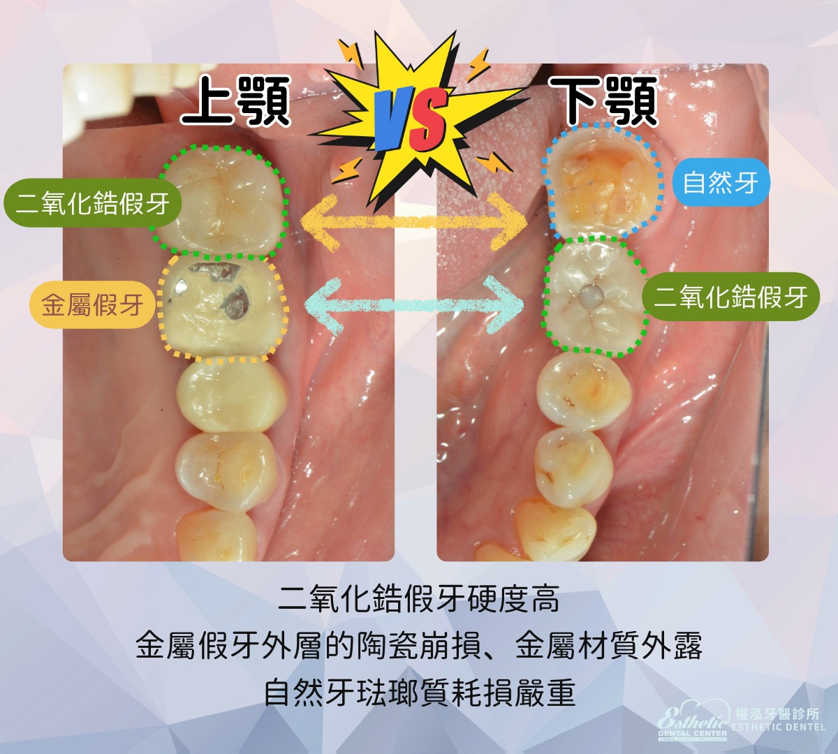 臨床建議:若病患使用較硬的金屬假牙,應密切關注其與對頜牙的接觸情況,避免過度磨損,美觀度較不佳。