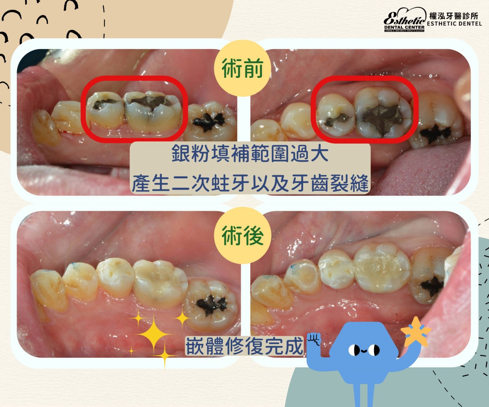 許多患者過去曾使用 銀粉填補 修復蛀牙,但你知道嗎?隨著時間推移,銀粉可能因熱脹冷縮而產生 微小縫隙,讓細菌有機可乘,導致二次蛀牙,甚至讓牙齒變得更脆弱,出現裂縫!