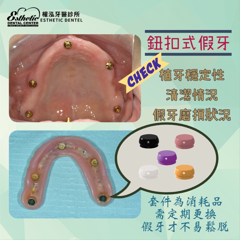 套件是有壽命的:鈕扣式假牙的橡膠圈、植牙的螺絲等,都需要依據使用狀況進行定期更換。