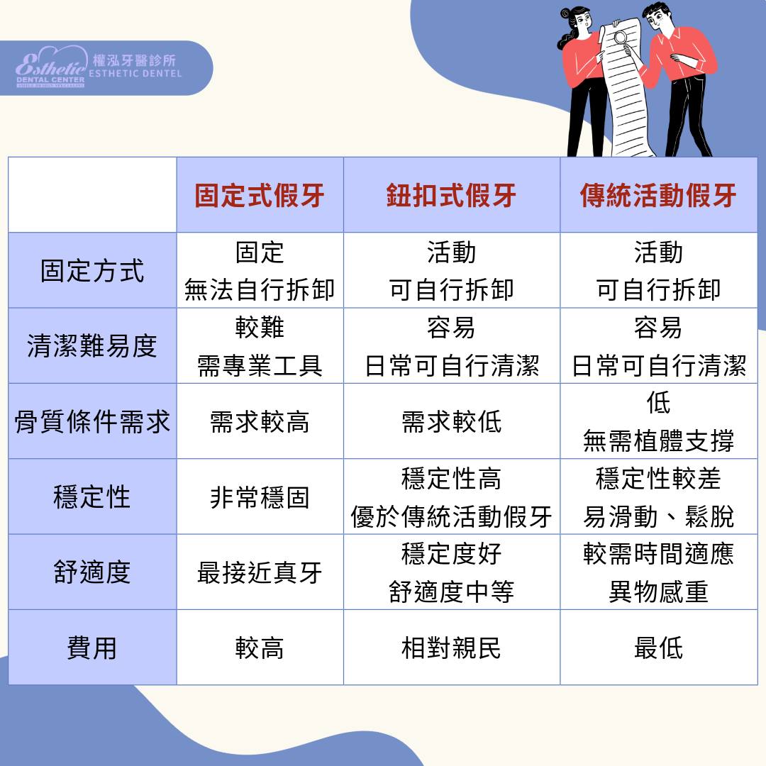 當牙齒缺失需要全口重建時,許多人最常遇到的問題就是:到底該選固定式假牙、鈕扣式活動假牙,還是傳統活動假牙?
