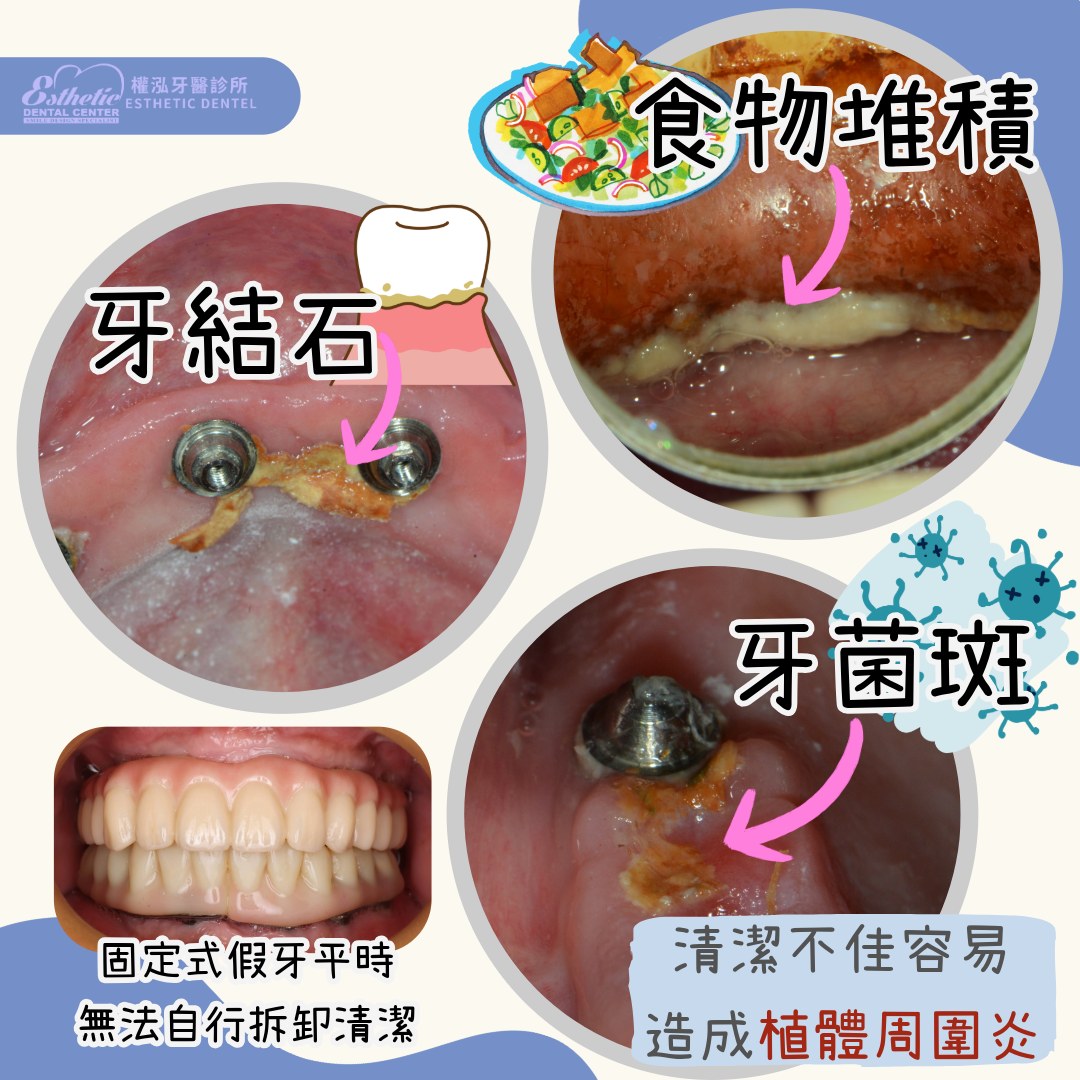 缺點:清潔難度較高,需要使用沖牙機、牙橋穿透線、牙間刷、特殊牙刷等工具(見圖示)。若清潔不確實,容易造成 食物殘渣堆積、牙菌斑與牙結石,進而導致 植體周圍炎,後續處理困難且費用較高。