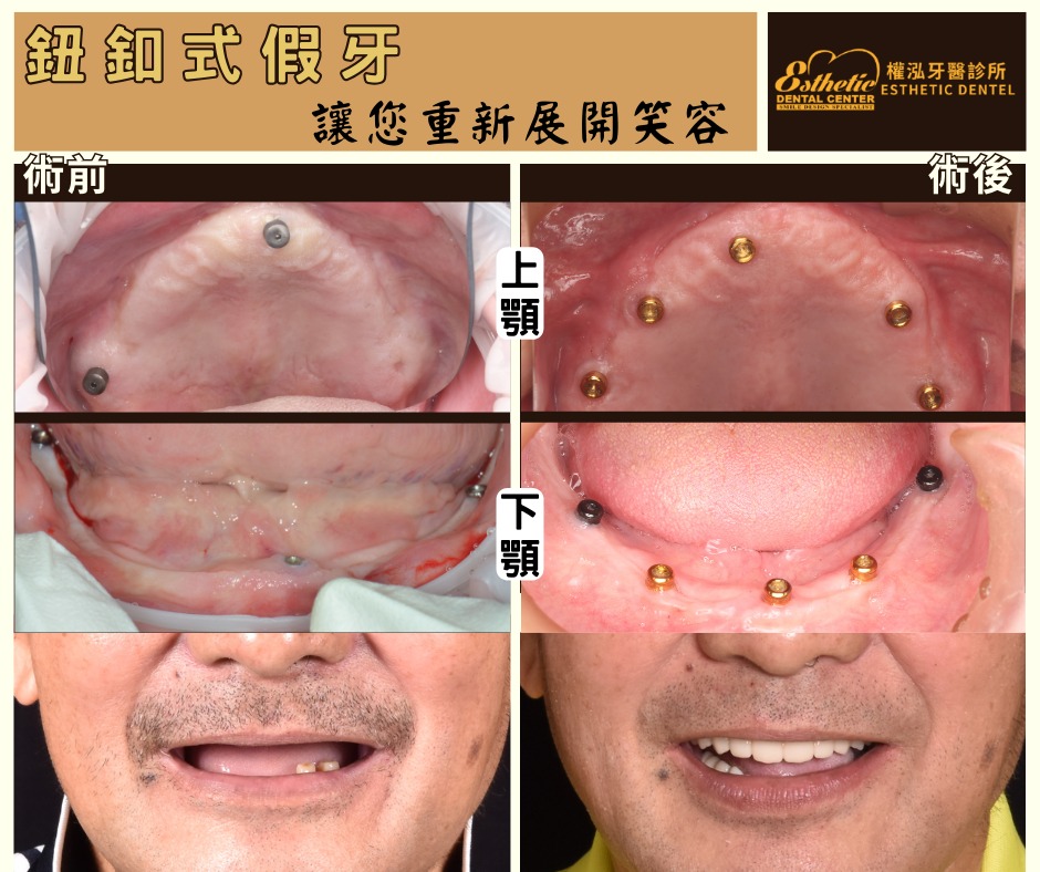 相較於全口重建的 All-on-4 固定假牙,鈕釦式假牙費用更親民,對許多中老年朋友來說,是兼顧實用與預算的好選擇。