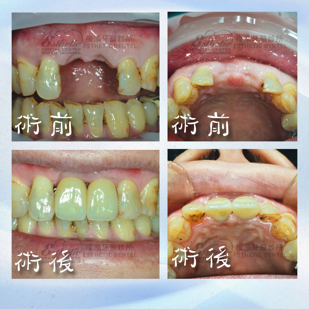 這位患者因為長期牙周病,前排兩顆門牙已經無法保留,只能選擇拔除。然而,「前牙重建」是所有植牙治療中最具挑戰性的區域之一,因為它不僅攸關微笑的外觀,更直接影響日常生活的發音與咬合功能。