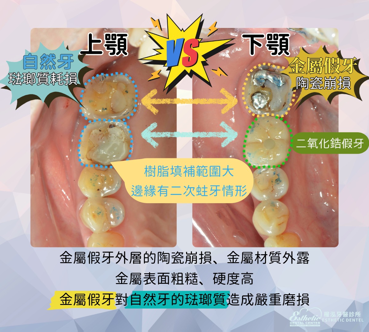 臨床建議:若病患使用較硬的金屬假牙,應密切關注其與對頜牙的接觸情況,避免過度磨損,美觀度較不佳。