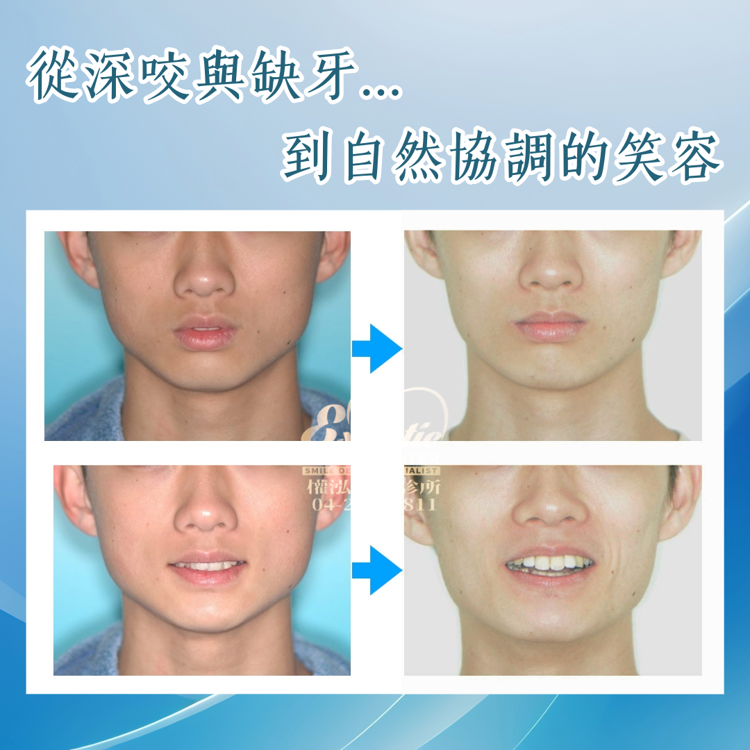 經過一連串縝密的矯正治療與手術規劃後,我們成功讓他的咬合恢復穩定,臉部線條也變得自然協調,笑容更加自信。雖然先天條件不足讓這個治療過程充滿挑戰,但成果非常值得。 值得一提的是,患者最終選擇的牙齒顏色也經過個人喜好挑選,是他自己參與決定的一部分,讓整體結果更貼近他的期待。