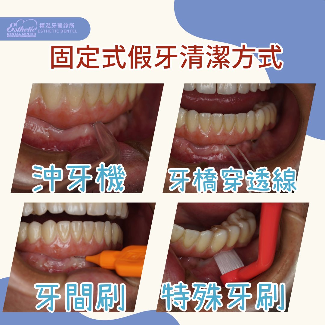缺點:清潔難度較高,需要使用沖牙機、牙橋穿透線、牙間刷、特殊牙刷等工具(見圖示)。若清潔不確實,容易造成 食物殘渣堆積、牙菌斑與牙結石,進而導致 植體周圍炎,後續處理困難且費用較高。