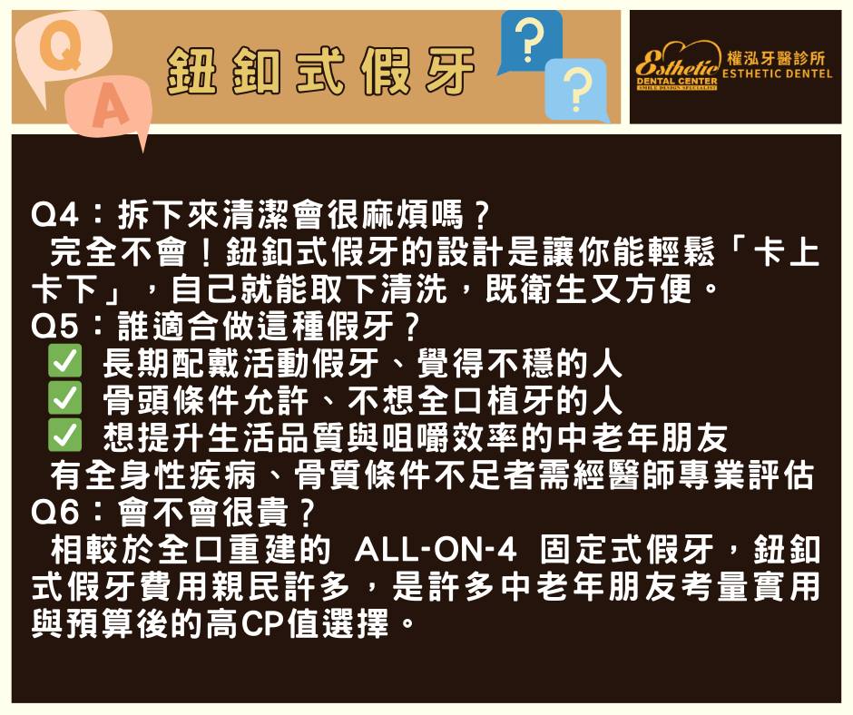 相較於全口重建的 All-on-4 固定假牙,鈕釦式假牙費用更親民,對許多中老年朋友來說,是兼顧實用與預算的好選擇。