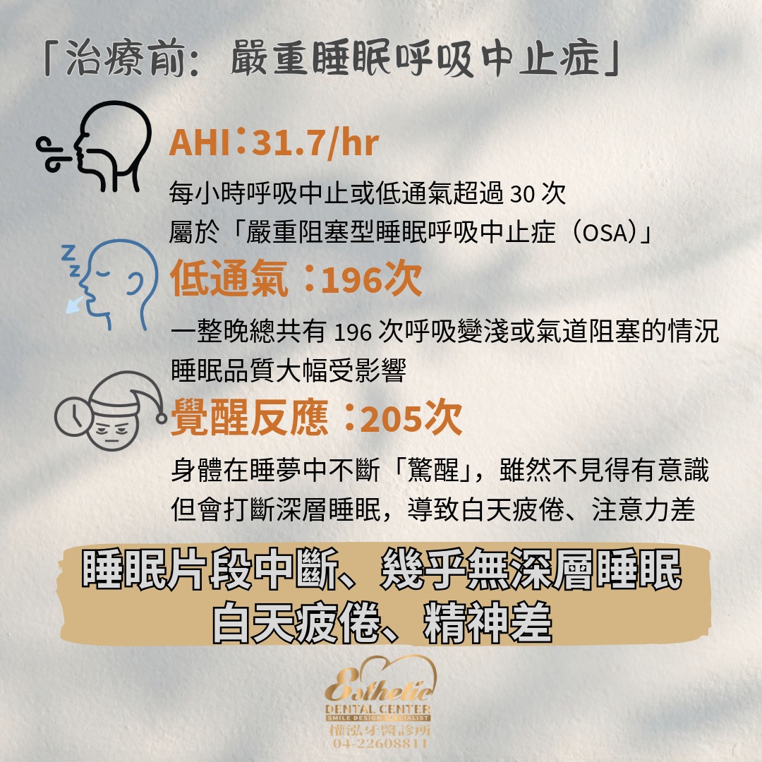 你知道嗎?打呼不只是惱人的噪音,更可能是「睡眠呼吸中止症」的警訊。這位患者初檢 AHI 高達 31.7(屬嚴重睡眠呼吸中止症),一整晚呼吸中斷近 200 次、驚醒反應超過 200 次,睡眠片段化,幾乎無深層睡眠。長期下來,不僅白天精神不濟,還會增加高血壓、中風、心臟病等風險。